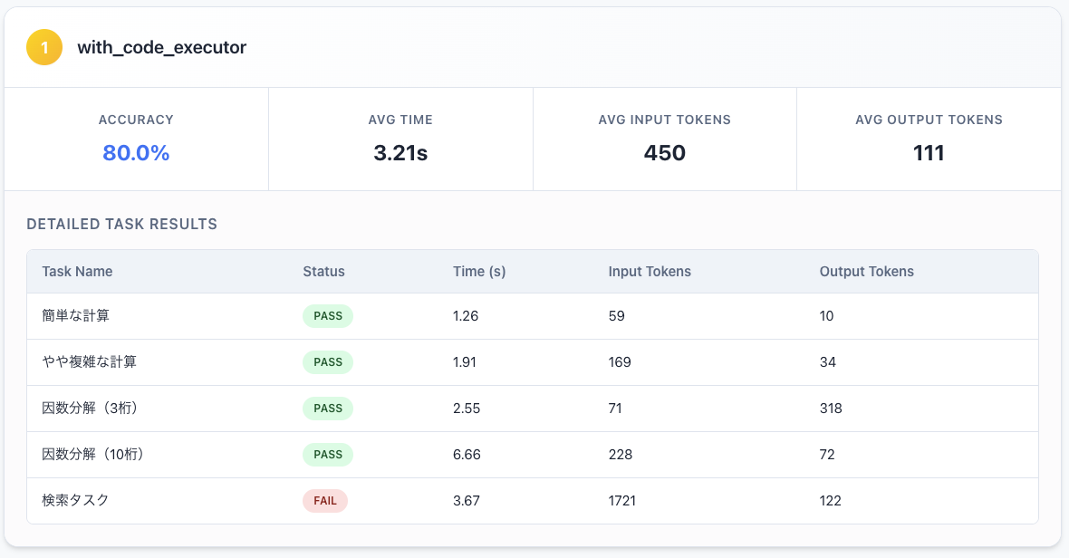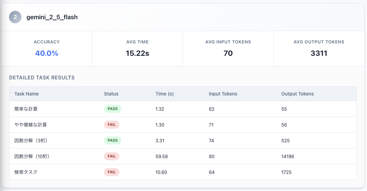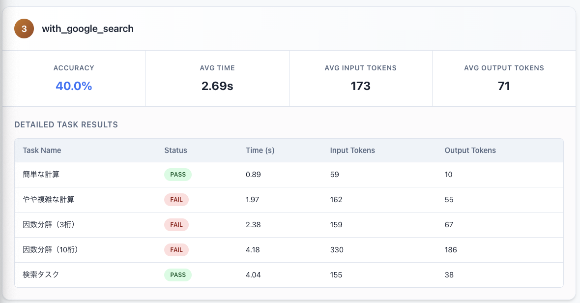 - 正解率だけでなく、経過時間や消費トークン数の指標を確認できる